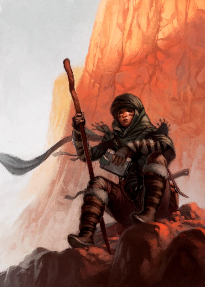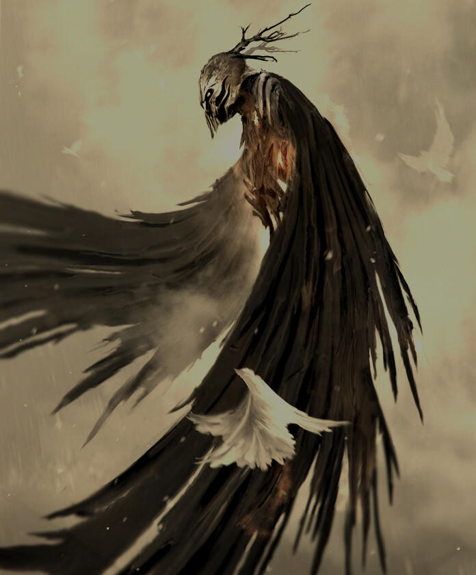 Plagued by frequent and sudden sand storms, the inhabitants of the Wastes know well the importance of shelter. Both from the flesh stripping winds, as well as the things that lurk within them. The Vultures are less a tribe and more a force of nature. No one is quite certain where the vultures dwell, but there is not a soul in the Wastes that has not borne witness to their flock. Wearing full body wing suits, these scavengers ride upon the tides of the winds and descend upon settlements that the storm drifts through. Should any leave their shelter, or be caught out in the open, they will soon find themselves swarmed by the screaming demons of the storm. A favored tactic of the Vultures is to keep to a high elevation in order to drop bombs or stones upon their disoriented victims. Only after they have killed will the Vultures descend to pick the corpse clean, scavenging what they can before taking flight upon the winds once again.